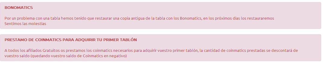 Se habran dado cuenta que se ha vuelto atras en los bonomatic, Anuntiomatic indica que esto se regularizara en los proximos dias asi que no temas por eso, otra noticia es que a todos los usuarios gratuitos se les da la posibilidad de adquirir un tablon de anuncio en forma de prestamo y dejando saldo negativo en sus coincmatic, que hablar yo ya soy byte, les sugiero lo hagan y comienzen a reventar la pagina en anuncios ahora esta mas facil el camino no le desaprovechen!